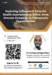 We’re excited to invite you to the 16th Webinar Series for Strengthening Fundamental Research Capacity with Drosophila in Rwanda! will feature Dr. Temitope Akhigbe Etibor, Postdoc at ETH Zurich, on the topic “Exploring Influenza A Virus for Health Innovations in Africa: From Genome Dynamics to Therapeutic Opportunities.” The session takes place on Tuesday, 30th September 2025 (today) at 11 am CAT.